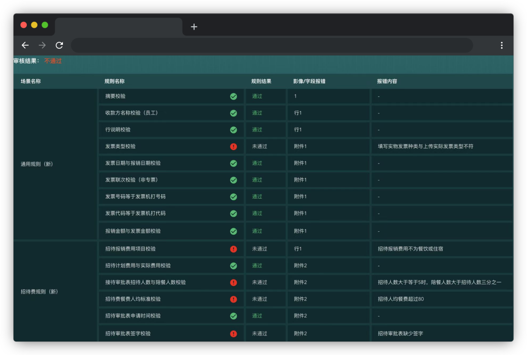 审单任务作为财务共享中心的核心任务,异常繁重且业务流程覆盖广,规则较为复杂,包括业务合规性、发票真实性、数据准确性、经济事项分类的正确性、流程审批的完整性等检查。无法采用传统的RPA技术实现,需要类似于人脑决策的审单规则建模、判断、决策的能力及算法。