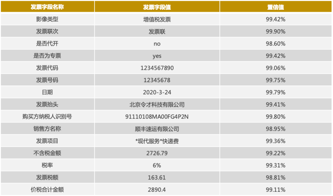 员工A报销一笔邮递费,报销指引要求提供报销单封面、有效发票和邮寄清单。员工A在报销系统中填写报销信息(即电算化信息),并将一张报销单封面、一张增值税专用发票和一张邮寄清单上传至影像系统。电算化信息和影像传送到OCR服务器进行票据版式识别,发票等制式票据由OCR进行数据识别并返回各数据置信值,置信值低于99%的字段,如下表中是否代开、销售方名称、发票税额由人工校对套件进行补充。为确保信息安全性,可将票据进行切割后,只把需要补充的部分发布到智能审核平台由人工进行补充。每一份字段的置信值可根据票据实际情况和客户需求进行自定义,实现0%-99.99%的区间设置。